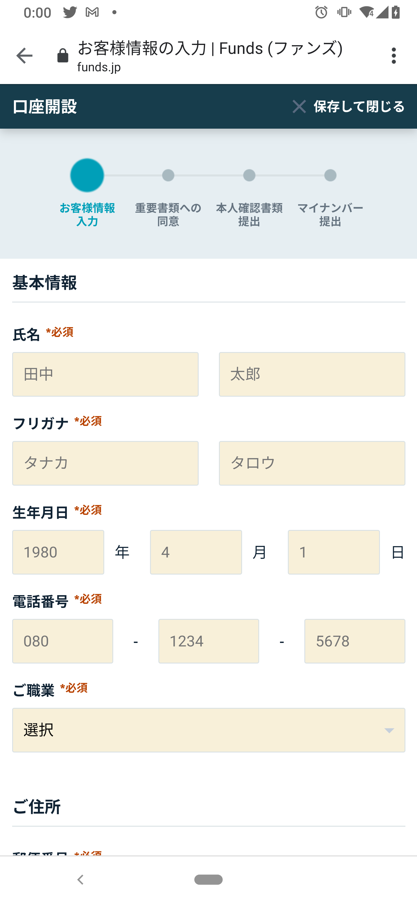 名前、生年月日、電話番号、住所、年収、投資経験、資産、出金先口座などを入力します。
