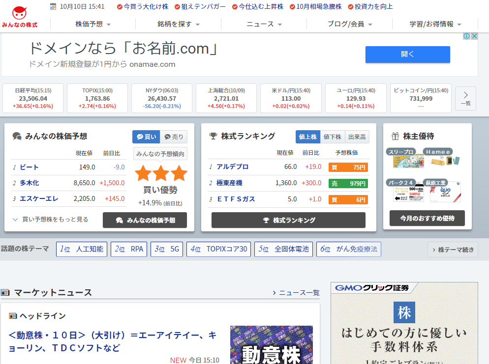 個人投資家の売買予想、予想株価がわかる株式投資の総合サイトであるみんかぶ。
