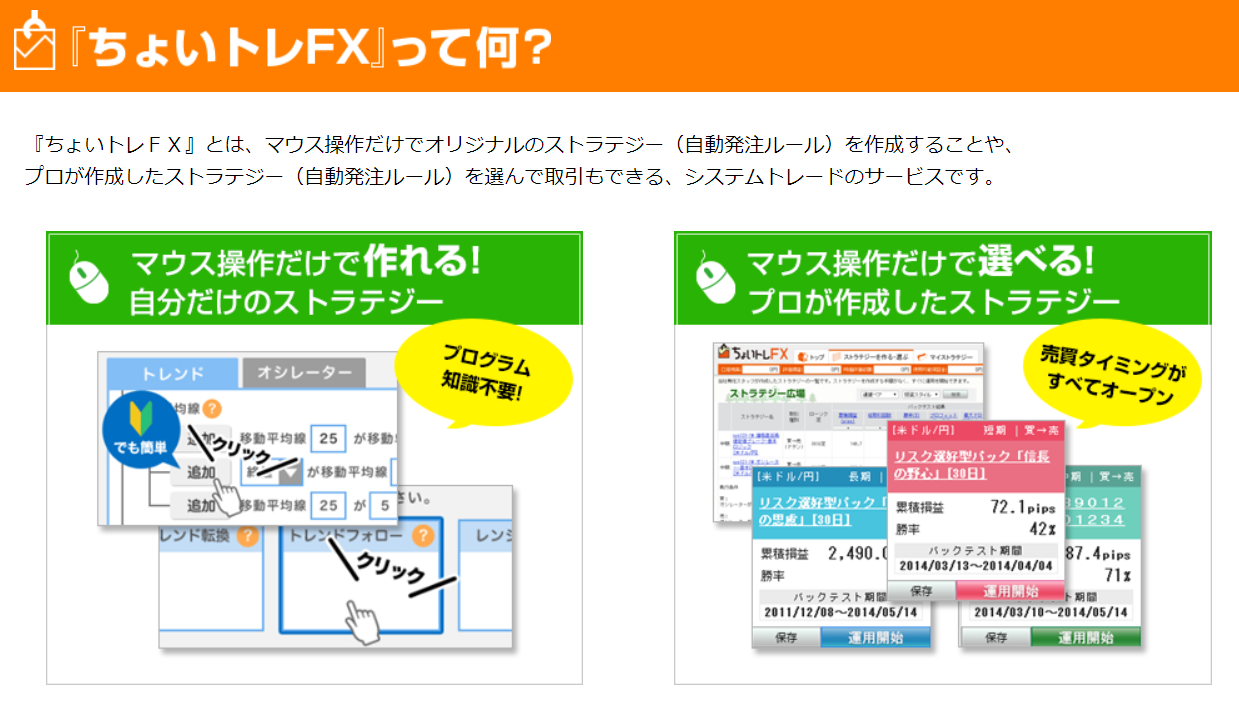 最後にFXプライムbyGMOの「ちょいトレFX」です。ちょいトレFXの特徴は、初心者でも簡単にストラテジーを組むことができる「選択型」を導入していることです。また「ちょいトレFX」は初心者への配慮が徹底していて、戦略を選ぶ際に詳しいガイドが用意されていたり、過去の為替レートをもとにストラテジーの運用成績を検証したりする機能がついています。