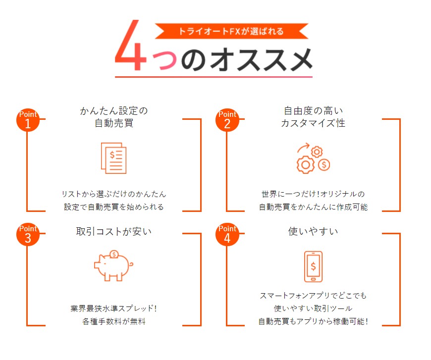 次にインヴァスト証券の「トライオートFX」です。トライオートFXの特徴は、「選択型」のシステムトレードに加え、簡易的な「プログラム型」機能を有していることです。プログラミングはできないけど、自分だけの設定で自動売買を行いたいという方におすすめです。
