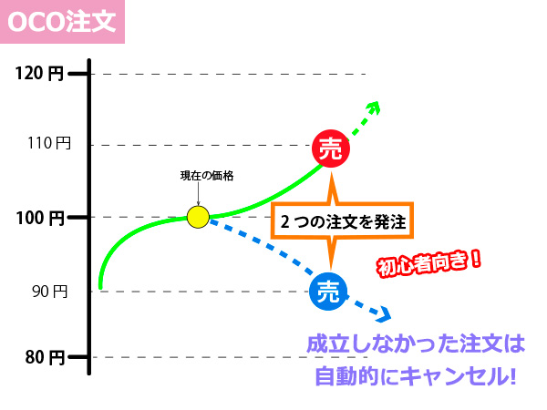 初心者に最もおすすめの注文方法は「OCO注文」と呼ばれる方法で、この方法は「指値注文」と「逆指値注文」を組み合わせた方法です。現在ドル円が100円だったとして、今後101円に上がったら売りたい(利確)と99円に下がったら売りたい(損切り)を同時に注文するということです。こうすることで、持っているポジションに対して利益確定と損切りを同時に行うことができるので、小さな利益をコツコツ積み上げて、損失は最小限に抑えるといった運用が可能です。またOCO注文は、どちらか一方の取引が成立した場合は、どちらか一方の取引が消滅するといった特徴がありますので、安心して利用することができます。