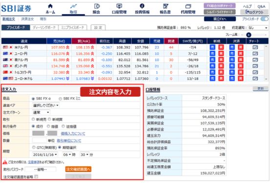 - 「注文内容を入力」するフォームより、「通貨ペア」の種類を選択