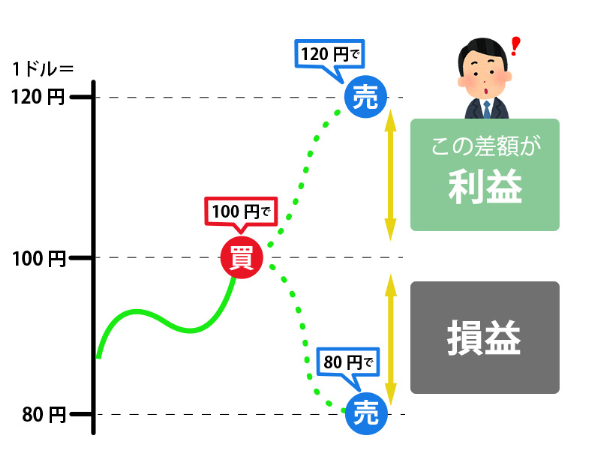 FXは通貨売買の為替を利用して利益を狙う取引方法です。為替は常に変動しているので、1ドル=100円のときもあれば、1ドル=120円のときもあります。FXの売買益を得るためには、安く買って高く売ることが大切です。
