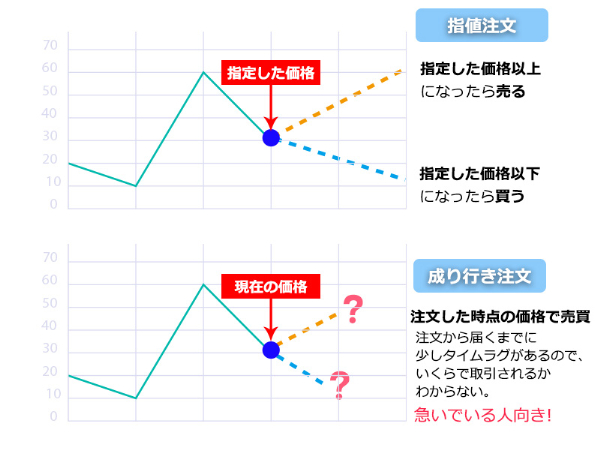 ここでは基本的な注文方法である「指値注文」と「成行注文」について解説します。