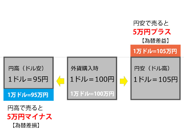 1ドル=100円のときに1万ドル購入したとして、1ドル=105円に値上がりしたときに1万ドルを売却したとします。
