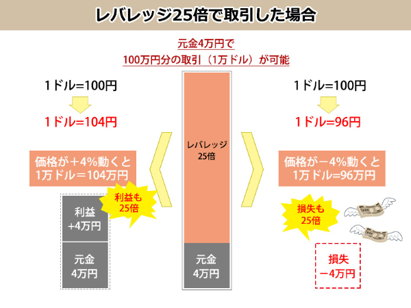しかしこの手法は大きなリスクが伴うため、あまりおすすめできません。25倍の取引を行えば利益がでたときは25倍の利益になりますが、損失がでたときも25倍になるからです。