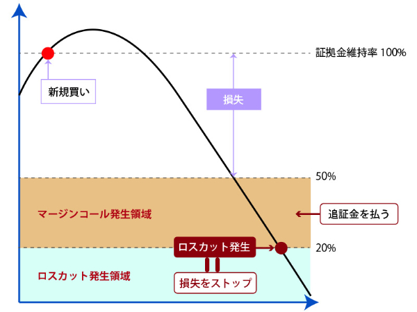 レバレッジをかける際には、ロスカットと追証に注意です。ロスカットとは、FXによる損失が拡大したときに起こりうる「強制決済」のことをいいます。