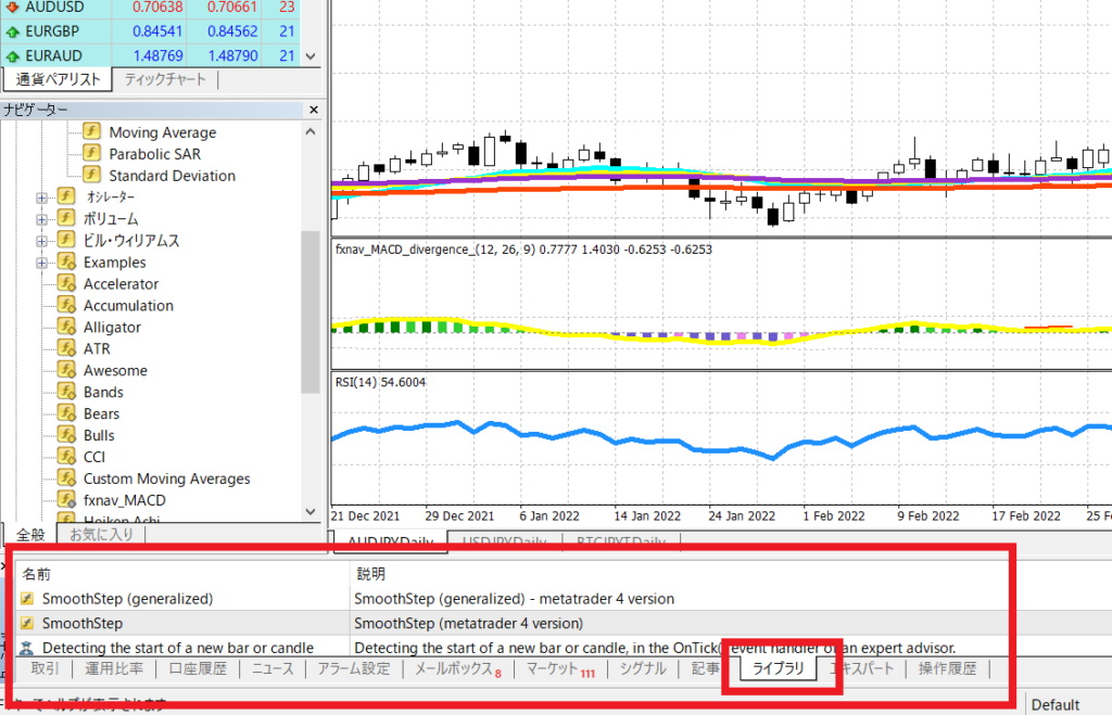 前述したMQL5.communityのEAは、MT4やMT5の画面下方にある「ターミナル」ウィンドウの「ライブラリ」からダウンロードして追加することもできます。
