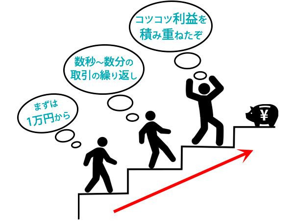 また、上述の通りレバレッジをかけることができるとはいえ、元手が1万円では得られる利益も限りがあります。したがってスワップポイントを狙うといった中長期のリターンではなく、売買を繰り返すことで得られる利益を積み重ねていく必要があることを理解しましょう。コツコツと売買を繰り返して元手を福利で増やしていくことを主眼としたトレードがスタートということを肝に銘じましょう。