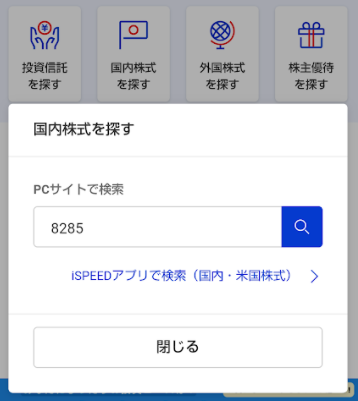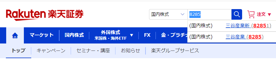 楽天証券の総合口座にログイン後、「国内株式を探す」をタップすると表示される検索窓に、三谷産業の証券コード「8285」を入力して検索します。