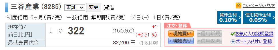 三谷産業の単元株数は100株、株主優待を受け取れるのも100株からなので、「三谷産業の株価×100株」以上の入金が必要です。