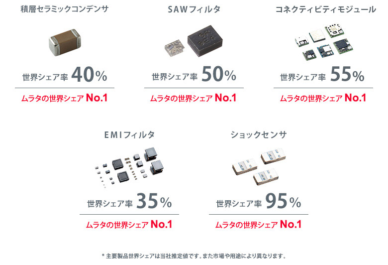 難しい説明は避けますが、「チップ積層セラミックコンデンサ」「表面波(SAW)フィルタ」「デュプレクサ」「セラミック発振子」「EMI除去フィルタ」「無線LANモジュール」「ブルートゥースモジュール」「インダクタ」といったものが5G用に新規開発される電子部品ですが、上記の中では「インダクタ」以外は世界シェア1位、「インダクタ」も日本企業のTDKに次いで世界シェア2位なのです。