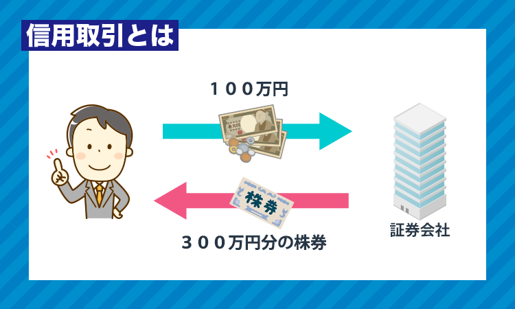 信用取引とは、自分の資金を委託保証金として証券会社に預けて、証券会社からお金を借りて自己資金以上の金額で株取引を行うことです。