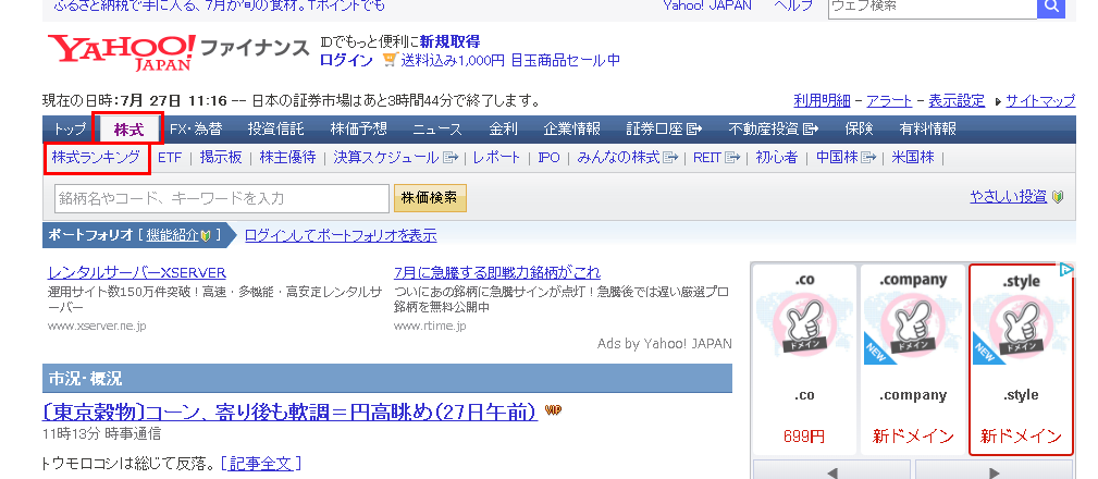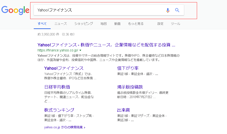 Yahoo!ファイナンスTOPページ上部にあるタブから、「株式」をクリック