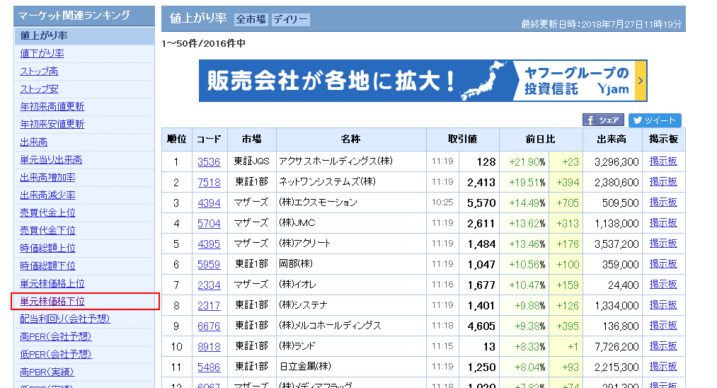 そうするとランキングページに飛びますので、まずは市場を選んで、期間はデイリーを選びます。その次にページ左にある「マーケット関連ランキング」にある、「単元株価格下位」をクリック